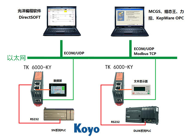 5、支持光洋ECOM/UDP以太网协议通信,支持上位机软件(KepWare OPC服务器等)以光洋的以太网驱动访问。